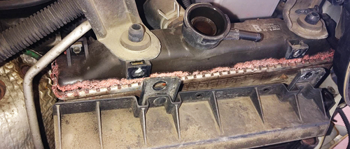 | ダイハツミラのラジエーター交換です。 上側のオレンジ色はラジエーターの水が漏れた跡です。 |