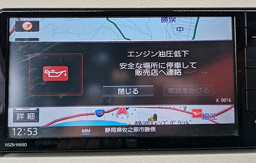 | ナビ画面に注意喚起のコメントがでました。 オイル管理が良くないとナビに表示されます。 内部洗浄してオイル交換して終了です。 |