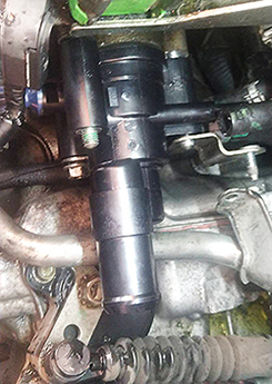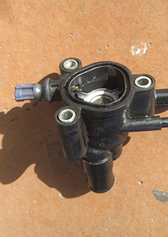 | 寒くなったのにヒーターが効かないとの事でサーモスタットの交換をしました。 ケースの中にサーモスタットがあります。 非分解なのでアッセンブリ交換です。 |