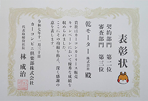| カーコンビニ倶楽部のリース契約での表彰状を頂きました。 お客様のおかげです! |