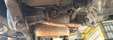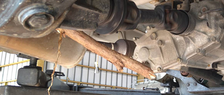 お客様から走行時に異音がするとの事。 リフトで上げて下回りを確認してビックリです。 まさかこんなに長い枝が車の下に入っていたなんて! |