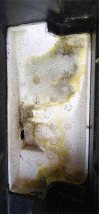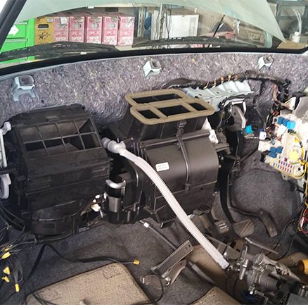 | スズキラパンのエアコンのガス漏れ修理です。 室内のパネルを外して室内機を分解してエバポレーターを交換しました。 漏れていた場所の色が変わっていました! |