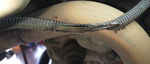 | テールランプの不灯との事で配線を調べていたら、 ハーネスがマフラーと接触してショートしていました。 まさかという故障でした! |